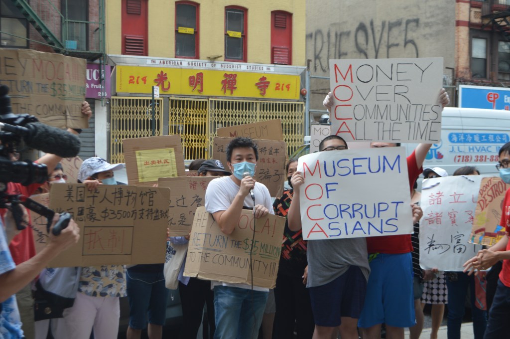 Protesting the eviction of Chinatown’s largest restaurant, Jing Fong restaurant by luxury developer, banker, and MOCA co-chair Jonathan Chu and calling for the return of the $35 million the museum received from the City to not oppose the City’s plan to construct a mega-jail in Chinatown.